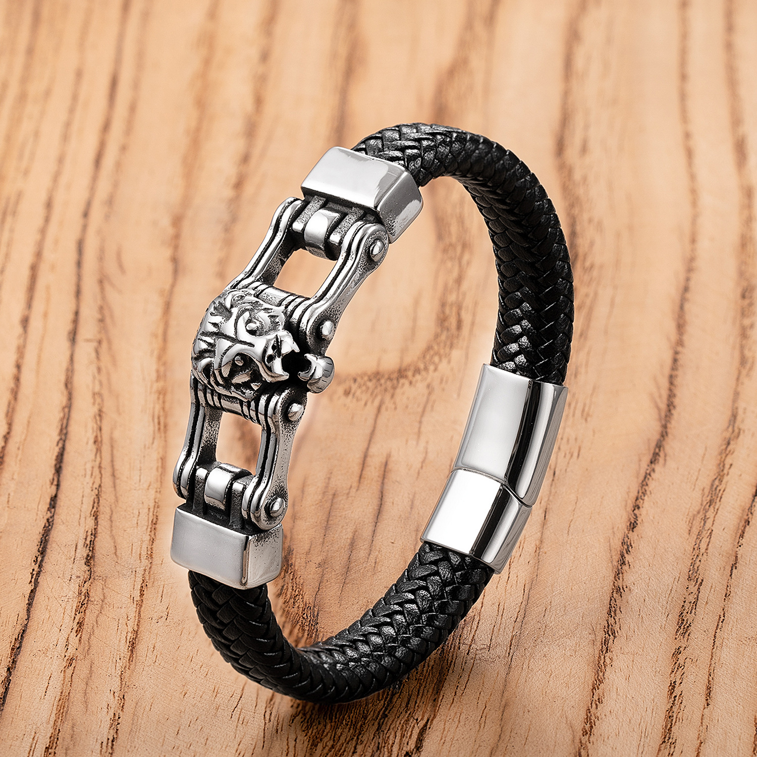 Lion Ox Head Tiger Heavy-Duty Stainless Steel Genuine Leather Magnetic-Clasp Mens Bracelet